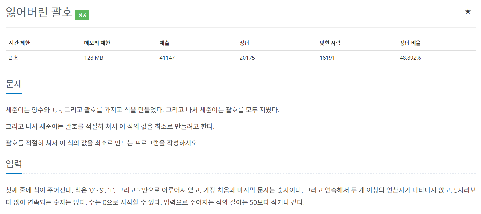 처음 이 문제를 접했을 때는 백트래킹 문제인 줄 알았다. 하지만 괄호 치는 경우의 수를 따진다음, 그 모든 경우의 수를 계산한 다음 min 값을 찾는 방식으로 백트래킹을 해야하는 줄 알았지만, 천천히 생각해보면, 뭔가 규칙만 찾으면, 간단한 풀이가 나올 것 같아서 천천히 봤더니, 그리디 문제임을 직감했다.