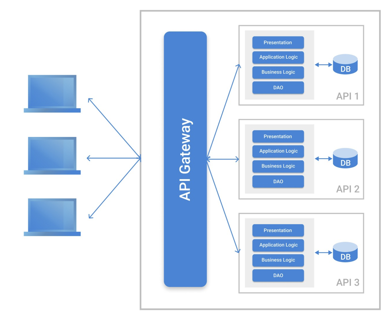 위 그림을 보면 알 수 있듯이, 각 서비스와 관련된 기능과 독립적인 DB를 가지는 구조로 표현된다. 각 서비스는 API 게이트웨이와 REST API를 이용한 통신 방식으로 사용자(외부)의 요청을 전달한다.