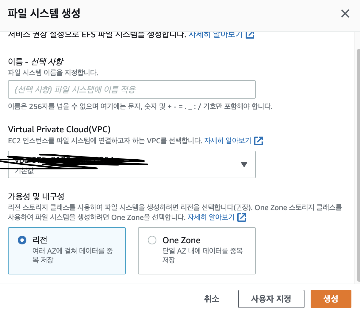이렇게 보안 그룹(Security Group) 준비를 마친 뒤, EFS를 생성해보도록 한다. EFS 생성 버튼을 누르면 다음과 같은 간단한 창이 나오지만 "사용자 지정 (Customize)" 버튼을 눌러서 상황에 맞게 설정을 바꿔보도록 한다.