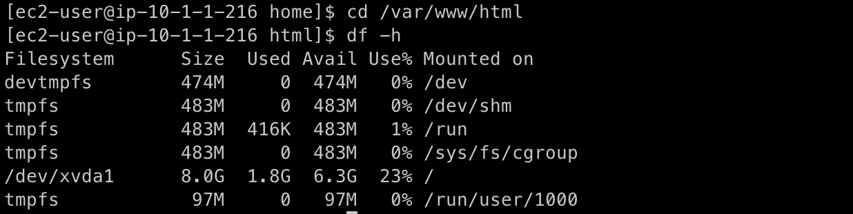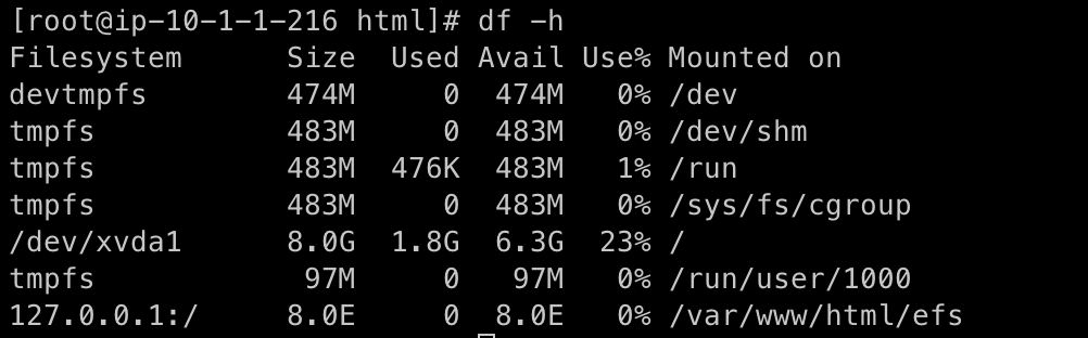 그리고나서, 마운트포인트를 만들어보자. 그러려면 AWS에서 만든 EFS를 클릭해서 우측 상단에 있는 "연결(Attach)" 버튼을 누른다. 연결 버튼을 누르면 창이 하나 뜨는데, 그 창에서 EFS 탑재 헬퍼(EFS mount helper)를 사용해서 연결하는 명령어를 복붙해와서 인스턴스에서 실행 후, "df -h" 명령어를 통해 파일 시스템 공간을 조회해보면, EFS 가 마운트 된 것을 확인할 수 있다.