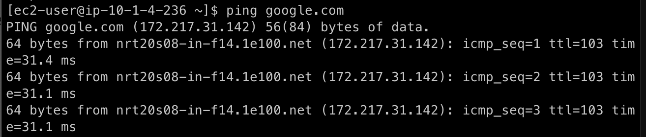 이렇게 NAT Gateway를 만들고, 그것을 Private 인스턴스의 라우팅 테이블에 추가해주게 되면 외부와의 통신이 가능해진다. 확인해보자.