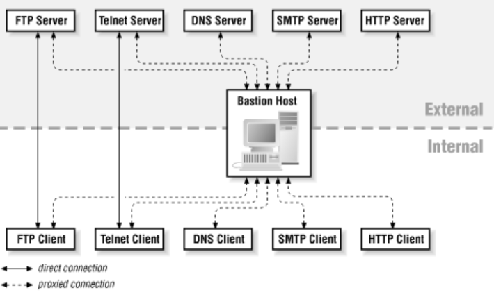 본래 Bastion host 는 내부 네트웍과 외부 네트웍 사이에 위치하는 게이트웨이이다. 보안대책의 일환으로 사용되는 Bastion host 는, 내부 네트웍을 겨냥한 공격에 대해 방어하도록 설계되었다. 네트웍의 복잡도와 구성에 따라 다르지만, 단일 배스천 호스트 그 자체로서 방어를 할 수도 있으며, 또는 다른 방호 계층과 함께 대형 보안 시스템의 일부가 되기도 한다. Bastion host 는 접근 제어 기능과 더불어 게이트웨이로서 가상 서버(Proxy Server)의 설치, 인증, 로그 등을 담당한다. 그만큼 위험에 노출되는 경우가 많기 때문에, Bastion host 는 네트워크 보안상 가장 중요한 방화벽 호스트이다. 특히 내부 네트워크 전체의 보안을 담당하기 때문에 관리자의 감시 및 정기적인 점검이 뒷받침되어야 한다. IT 보안 기업에서 제공하는 방화벽 솔루션은 이러한 Bastion host 를 제공하는 것이 대부분이다.