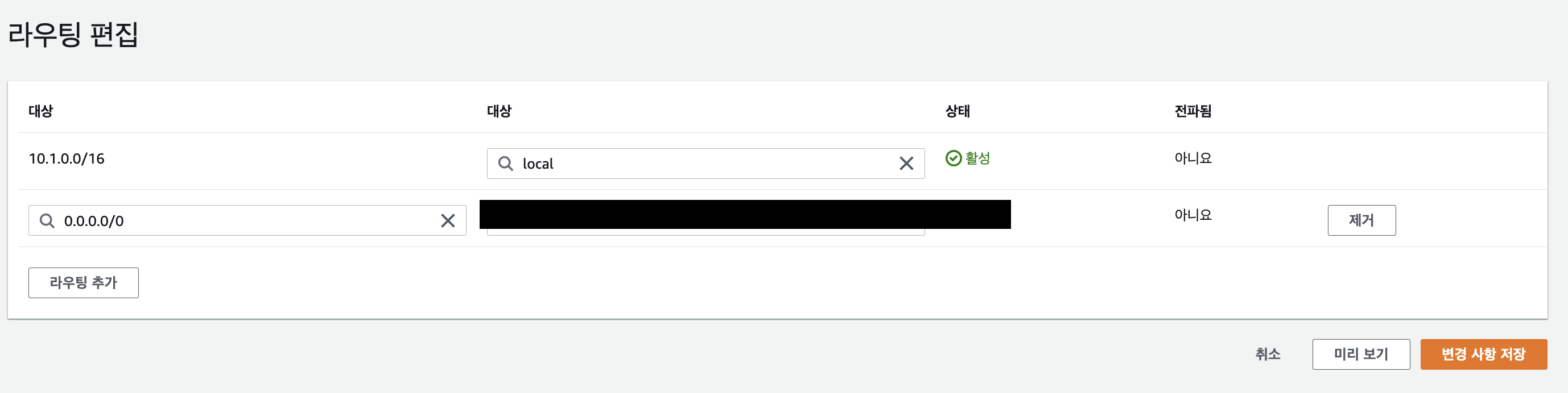 NAT Gateway를 만들고 난 뒤, private subnet의 라우팅 테이블(Route table) 에 NAT Gateway를 추가해서 Private EC2 instance가 외부와 통신할 수 있도록 만들어보겠다.