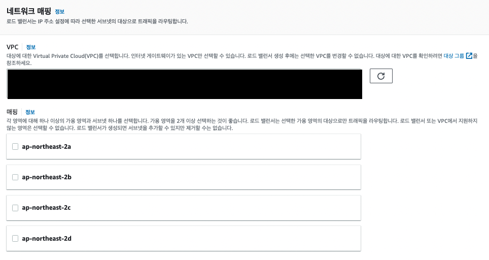 로드 밸런서를 만들 때에 "Network mapping"은 어느 가용 영역(availability zone)에, 어느 서브넷(subnet)으로 트래픽을 보낼지 결정하는 곳이다.