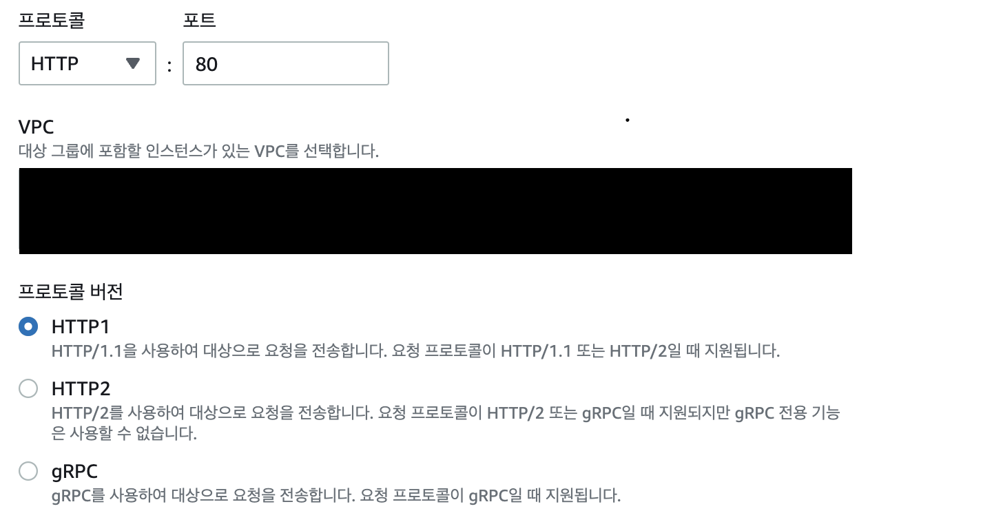 리스너 및 라우팅에서는 어느 타겟 그룹으로 트래픽을 전달할지를 결정한다. 타겟 그룹을 만들 때에도 프로토콜과 포트번호를 지정했는데, 타겟 그룹을 만들 때 지정한 프로토콜과 포트번호는 타겟이 되는 인스턴스와 ALB 사이의 통신에 대한 프로토콜과 포트번호였다. 하지만 해당 단계에서의 프로토콜과 포트번호를 지정하는 것은 외부 및 ALB 사이의 통신에 대한 프로토콜과 포트번호를 지정하는 것이다!