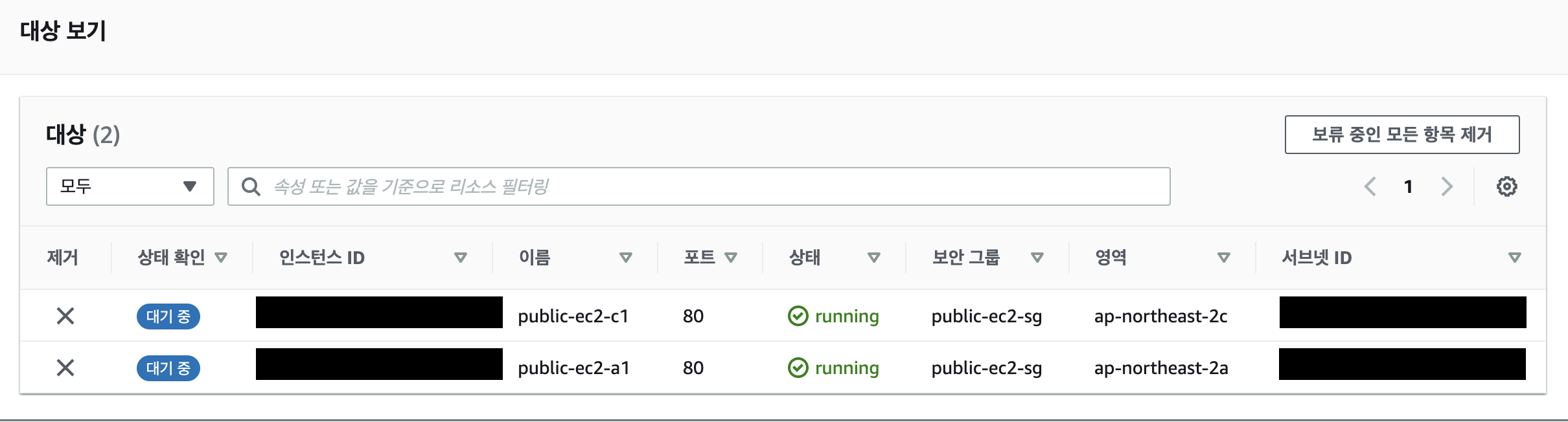 - 사전에 Public IP 주소가 없는 인스턴스 2개를 생성하고, 인스턴스 2개를 같이 묶은 Target Group(대상그룹)을 생성해놓고 실습하도록 한다.