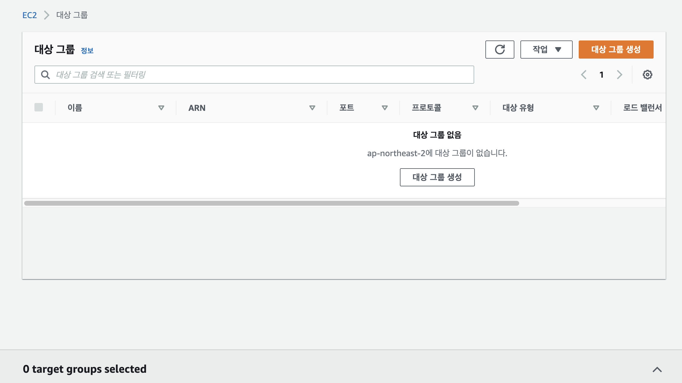 우선, EC2 서비스에서 "로드밸런싱" 란의 "대상그룹(Target Group)"을 선택해서 대상 그룹을 생성한다.