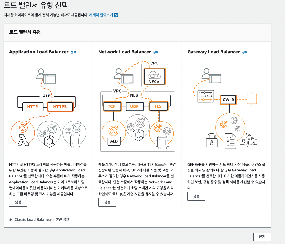 그리고나서 "로드밸런싱"의 "로드밸런서"에 들어가서 로드밸런서를 생성한다. 아래의 사진과 같이 로드밸런서 유형 중 만들고 싶은 로드밸런서의 유형을 선택한다. 지금은 Application Load Balancer를 만들도록 한다.
