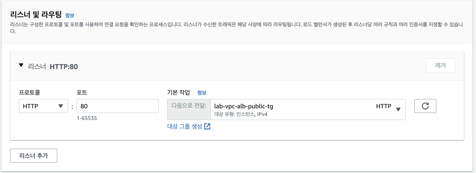 리스너 및 라우팅에서는 어느 타겟 그룹으로 트래픽을 전달할지를 결정한다. 타겟 그룹을 만들 때에도 프로토콜과 포트번호를 지정했는데, 타겟 그룹을 만들 때 지정한 프로토콜과 포트번호는 타겟이 되는 인스턴스와 ALB 사이의 통신에 대한 프로토콜과 포트번호였다. 하지만 해당 단계에서의 프로토콜과 포트번호를 지정하는 것은 외부 및 ALB 사이의 통신에 대한 프로토콜과 포트번호를 지정하는 것이다!