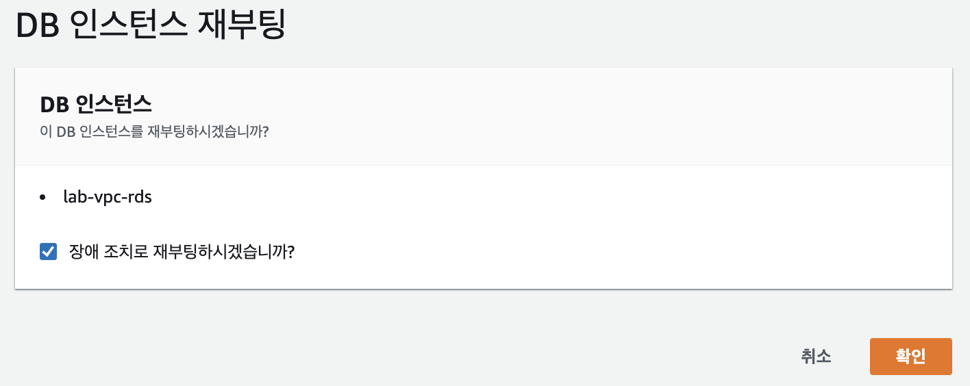 RDS database(Read replica 아님!) 의 '작업(Action)'에서 '재부팅(Rebooting)'을 누른 뒤, '장애 조치로 재부팅하시겠습니까? (Reboot with Failover?)' 란에 체크를 해준 뒤 재부팅시킨다. 재부팅이 완료되면, dig 명령어로 다시 한 번 RDS database의 엔드포인트를 입력해본다.