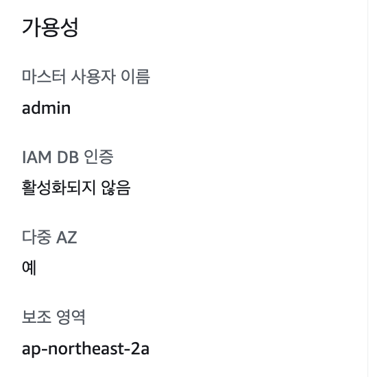 위와 같이 설정을 하고 마무리한 뒤 RDS 데이터베이스의 "구성"을 들어가서 확인해보면 다음과 같이 Multi AZ(다중 AZ) 에 'yes'라고 나오게 된다.