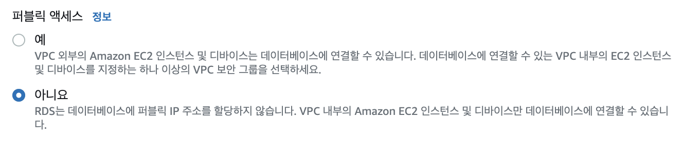 RDS의 DB에 퍼블릭으로 접근하지 못하도록 "퍼블릭 액세스"란에 '아니오'를 선택해준다. 이렇게 하게 되면 사진에서 보이는 것과 같이 외부에서는 DB에 접속이 불가능하고 Database가 존재하는 VPC 내부에서만 Database에 접근할 수 있다.