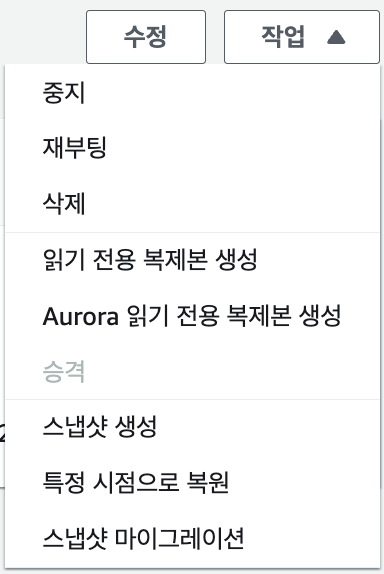 생성된 Database의 상세 페이지에 들어가서 '작업(Action)'에서 '읽기 전용 복제본 생성(Create Read replica)' 를 누른다.