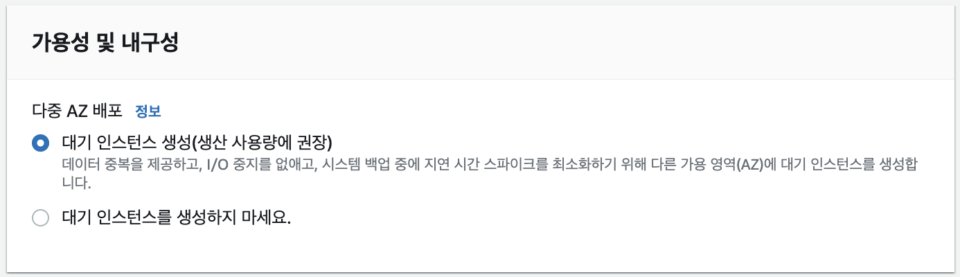 그리고 "가용성 및 내구성(Availabilty & durabilty)" 란에서는 Multi AZ deployment 에서 "대기 인스턴스 생성 (Create a standby instance)"를 선택해준다. 이는 복수의 가용영역에 데이터베이스를 생성하겠다는 것을 의미한다.