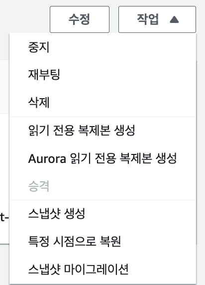 생성된 Database의 상세 페이지에 들어가서 '작업(Action)'에서 '읽기 전용 복제본 생성(Create Read replica)' 를 누른다.