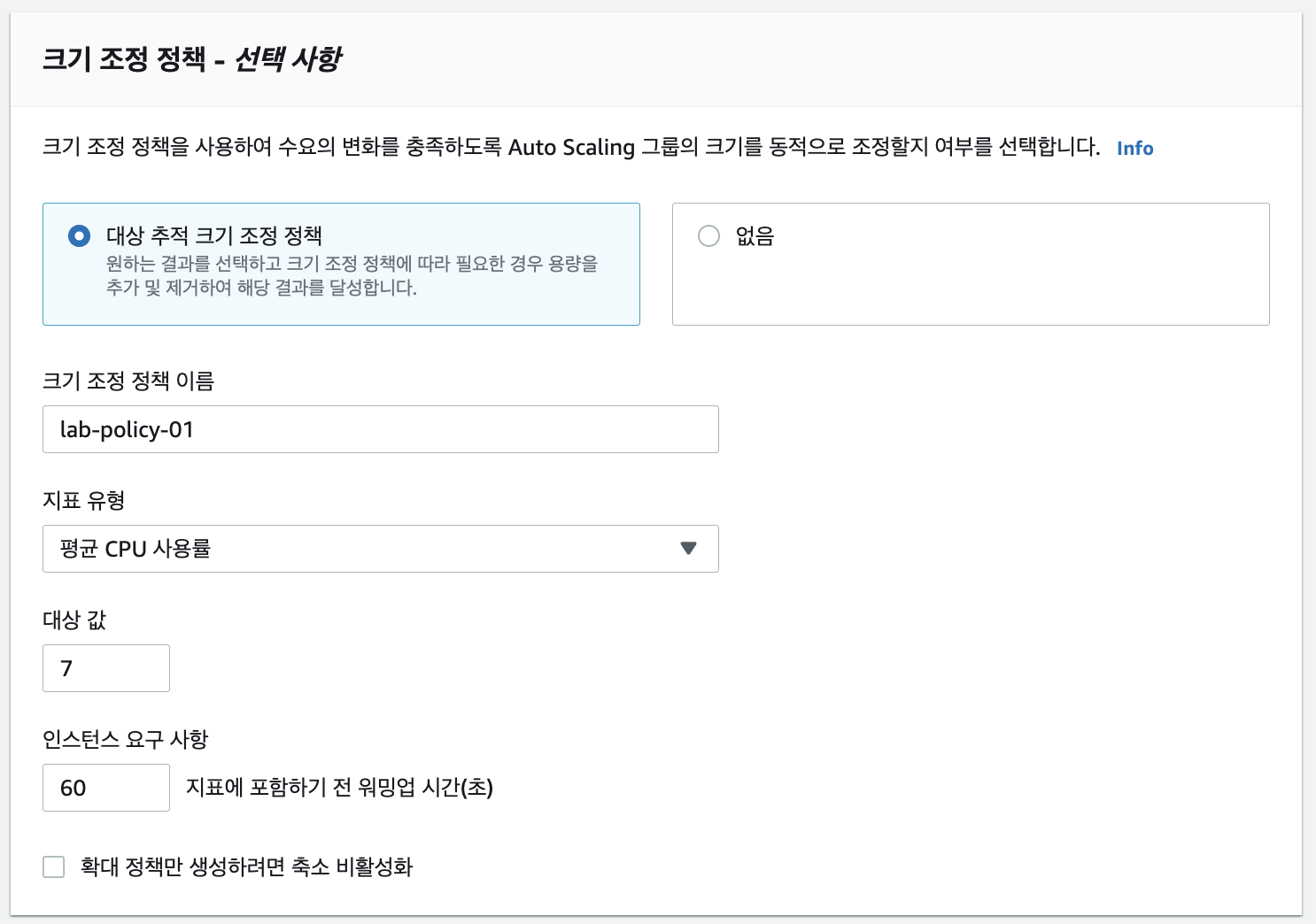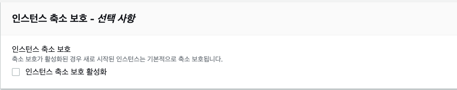 '인스턴스 축소 보호(Instance scale-in protection)'은 지표가 target value(대상 값) 아래로 내려와서 Scale-in이 발생할 때, Auto scaling으로 생성된 인스턴스가 삭제되지 않도록 해주는 항목이다. 인스턴스 축소 보호 활성화를 해주면, 인스턴스가 삭제되지 않는다. 해당 예제에서는 삭제할 수 있도록 비활성화해준다.