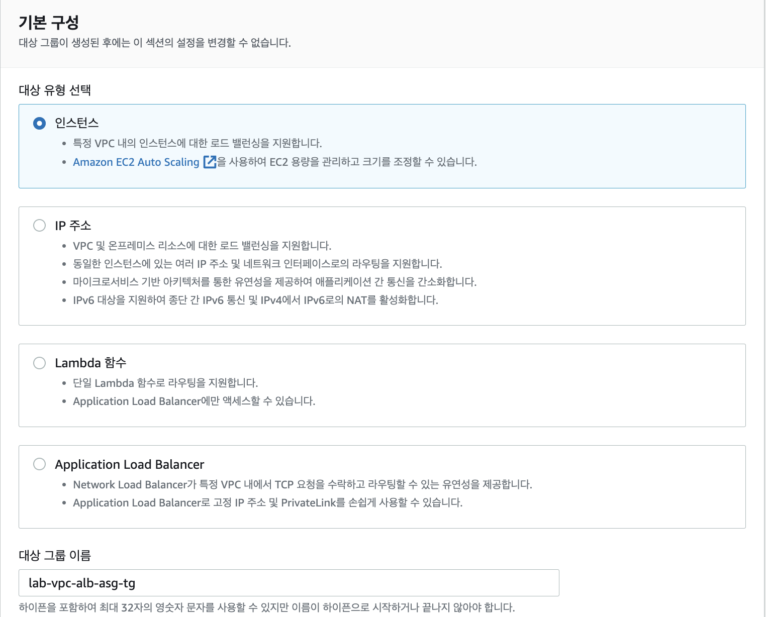 이제 Auto scaling 용 ALB를 생성해본다. 우선 Target group(대상그룹)을 만들어보자. 대상 유형은 인스턴스(instance)로 두고 대상 그룹 이름은 자유로 지정한다.