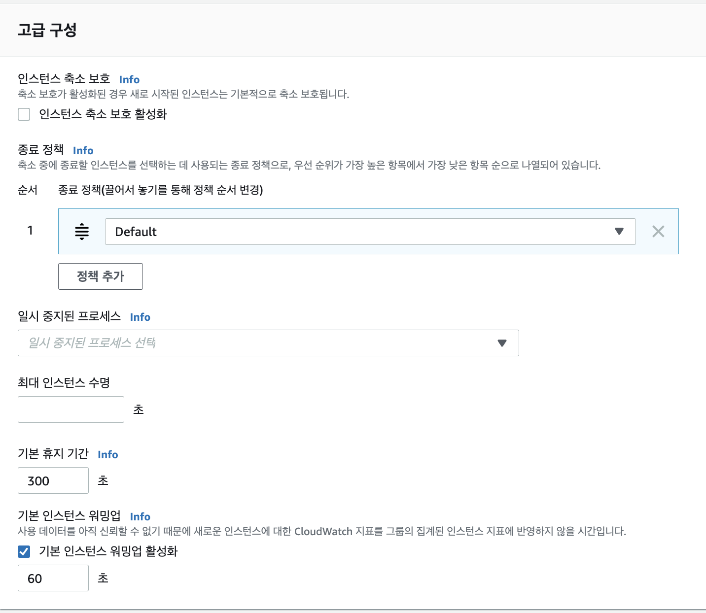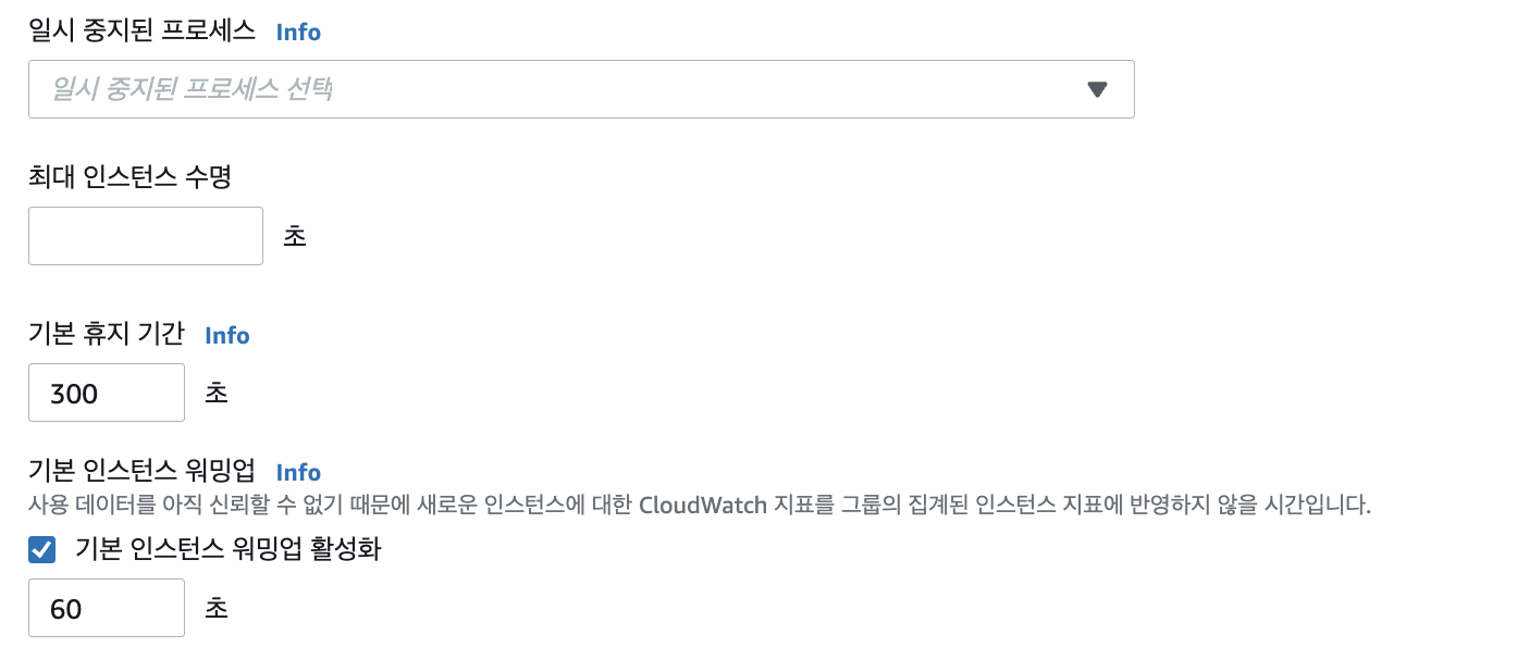 '기본 인스턴스 워밍업(Default cooldown)' 은 Auto scaling group에서 Scaling policy에 따라서 인스턴스가 생성되거나 제거될 때, 잠시 대기하게 되는 시간을 의미한다.