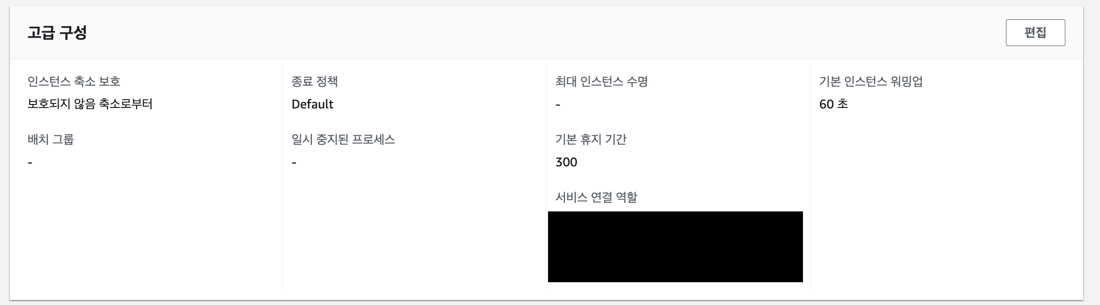 - "최소 용량(Minimum capacity)"는 활성화될 수 있는 최소의 개수를 의미한다. 그래서 Auto scaling group에서는 해당 개수 아래로는 떨어지지 않는다.