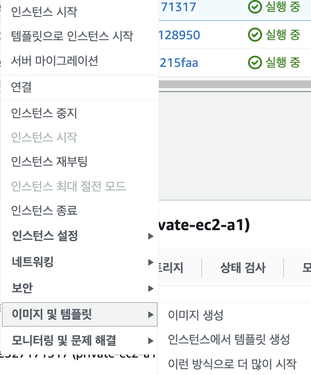 Private EC2 를 선택한 뒤 우클릭을 누르고 '이미지 및 템플릿' 선택 후 '이미지 생성'을 클릭한다. 앞에서 했던 것처럼 Tag 에서 'Name' 에 적절한 이름을 넣어주고 생성해준다.