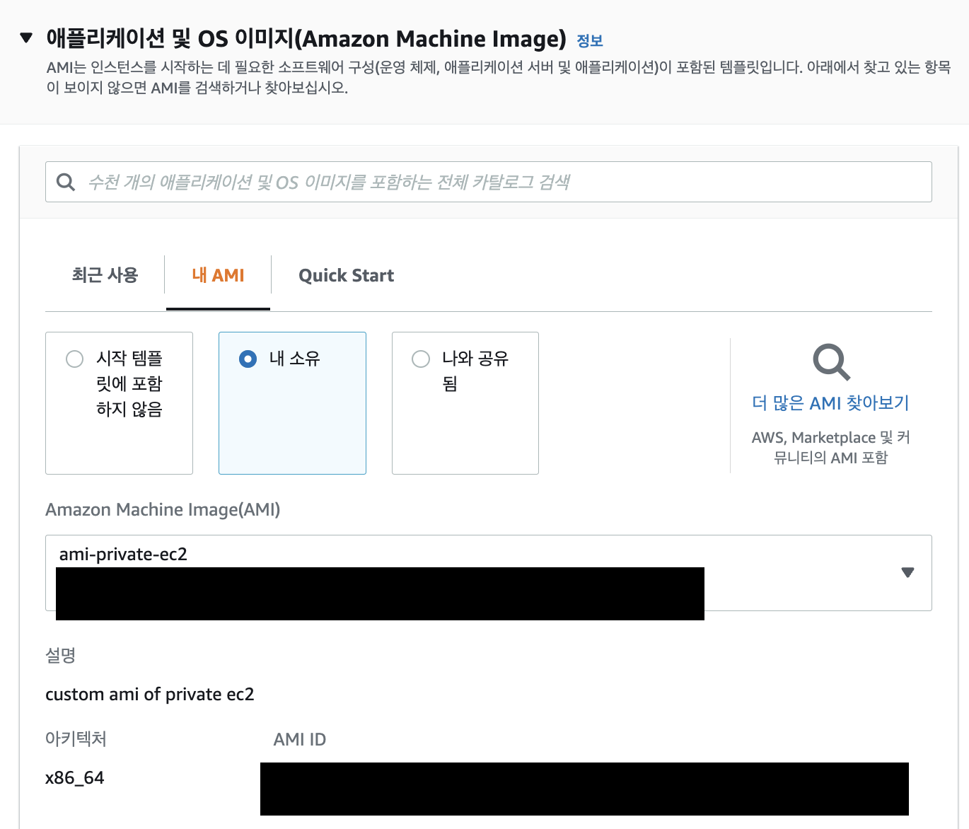 Launch Template을 생성하는 화면에서 "애플리케이션 및 OS 이미지"에서 아까 만들었던 ami-private-ec2를 선택한다.