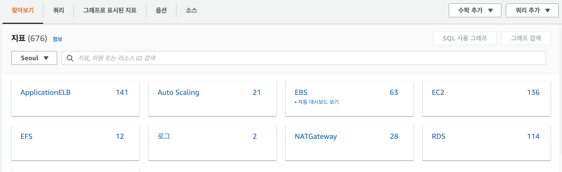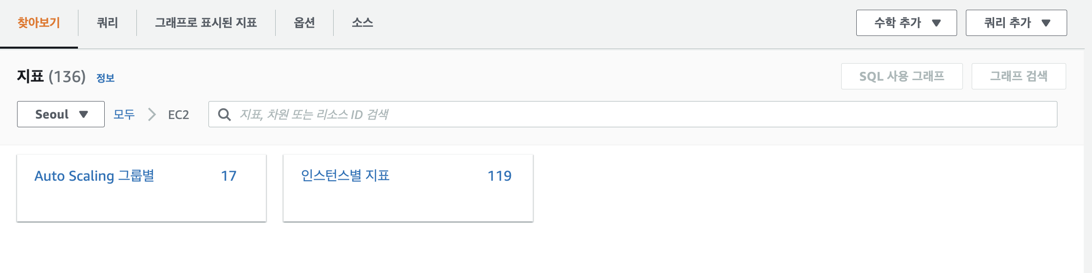 AWS 콘솔에서 "CloudWatch" 서비스로 이동 후, "지표(Metrics)" -> "모든 지표(All metrics)" -> "EC2" -> "인스턴스별 지표(Per-instance Metrics)" => 'CPUUtilization'으로 지표 검색