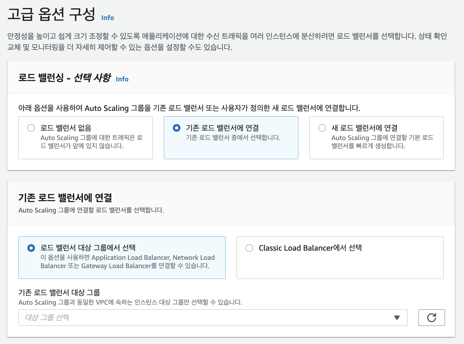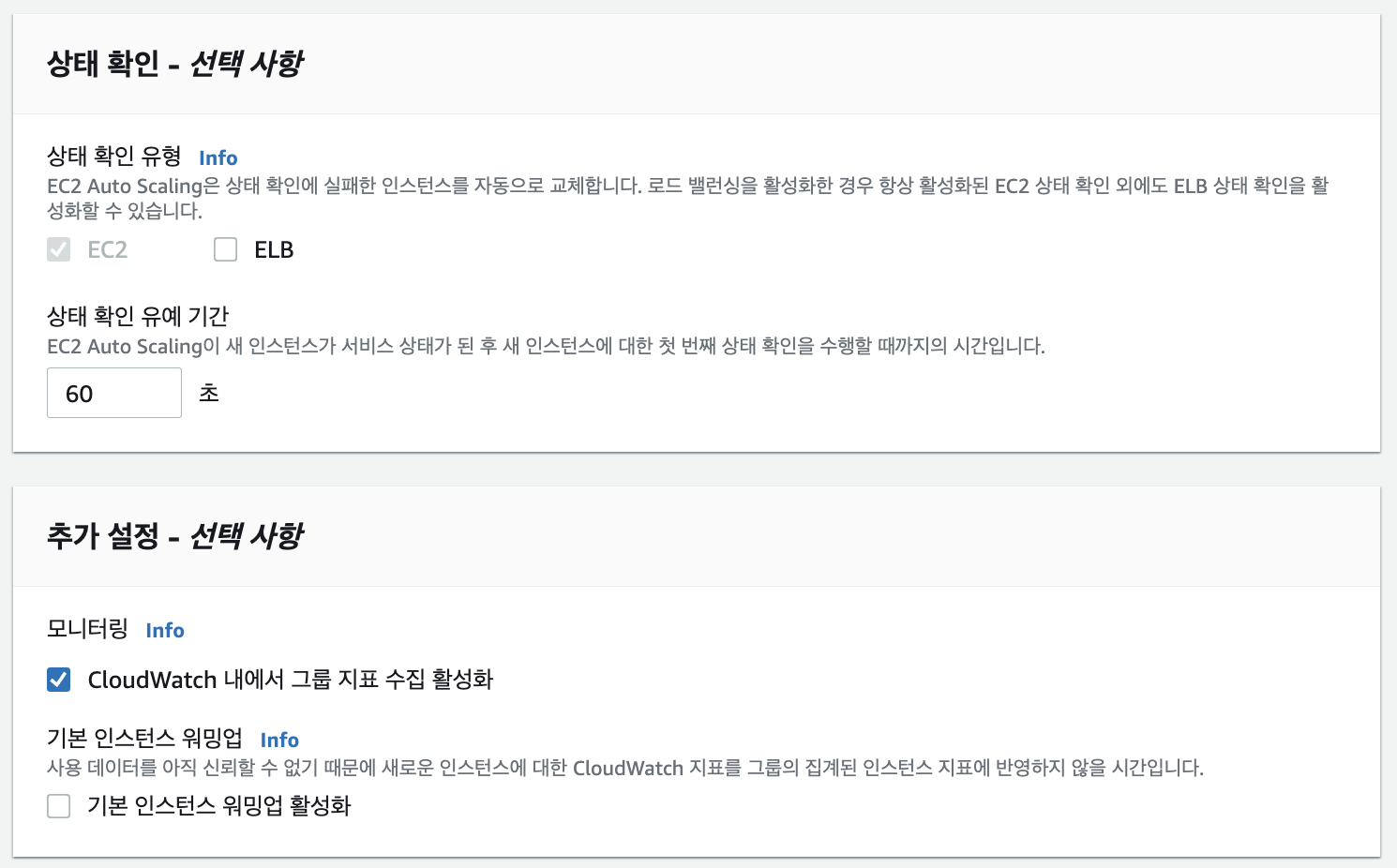 이제 아까 만든 로드밸런서를 해당 Auto scaling group에 연결시켜준다. 또한 '모니터링'에서 Auto scaling group에 대한 지표를 받기 위해 해당 체크박스에 지표 수집을 활성화시켜준다.