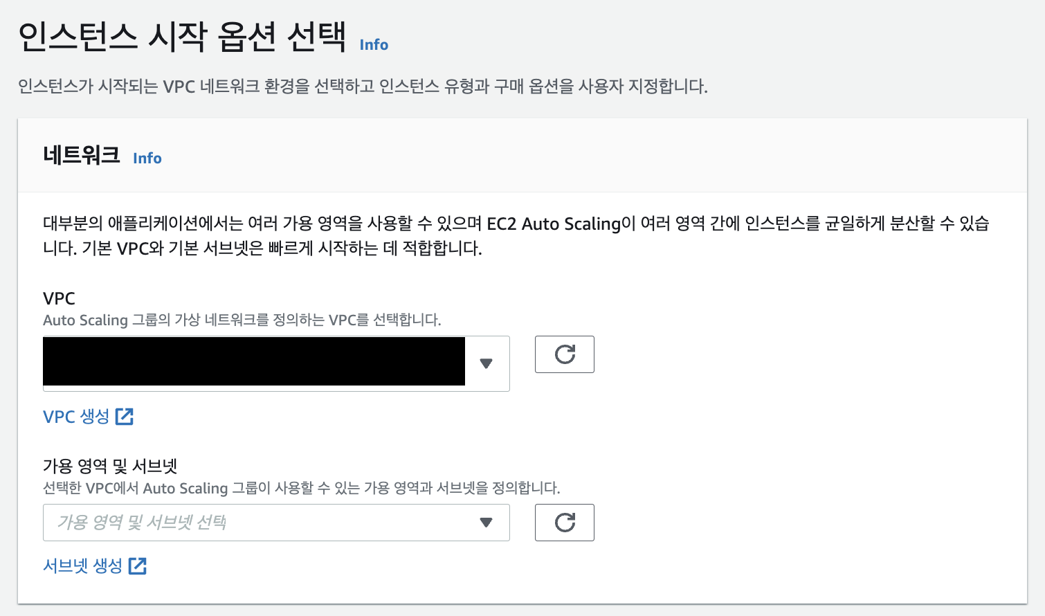 VPC는 내부적으로 사용하고 있는 VPC를 선택해준다. 그리고 "가용 영역 및 서브넷(Availabilty Zones and Subnet)" 가 의미하는 바는 해당 Auto scaling group을 통해 생성되는 인스턴스가 어느 가용 영역, 어느 서브넷에 생성되는지를 명시하는 선택하는 입력란이다.