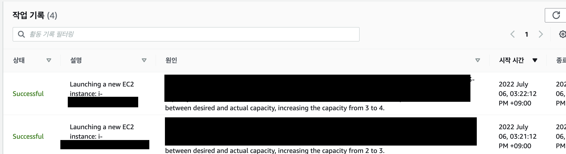 또한 해당 Auto scaling group의 "활동(Activity)"에 들어가보면, 다음과 같이 인스턴스가 2개에서 3개, 3개에서 4개로 Scale-Out된 것을 확인할 수 있다.