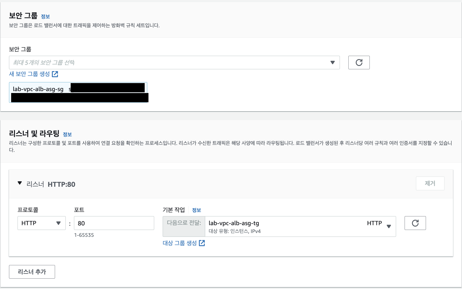 대상 그룹(Target group) 설정을 마쳤으면 로드밸런서를 생성해주는데, 신경써야할 부분은 해당 로드밸런서를 위한 보안 그룹을 생성해서 달아주는 것이고, 리스너 및 라우팅 란에서 '리스너'에 위에서 만든 대상 그룹(Target group)을 "다음으로 전달(Forward to)" 에 할당한다. 마지막으로는 잊지말고 Tag에서 "Name" 에 설정한 이름을 달아준다.
