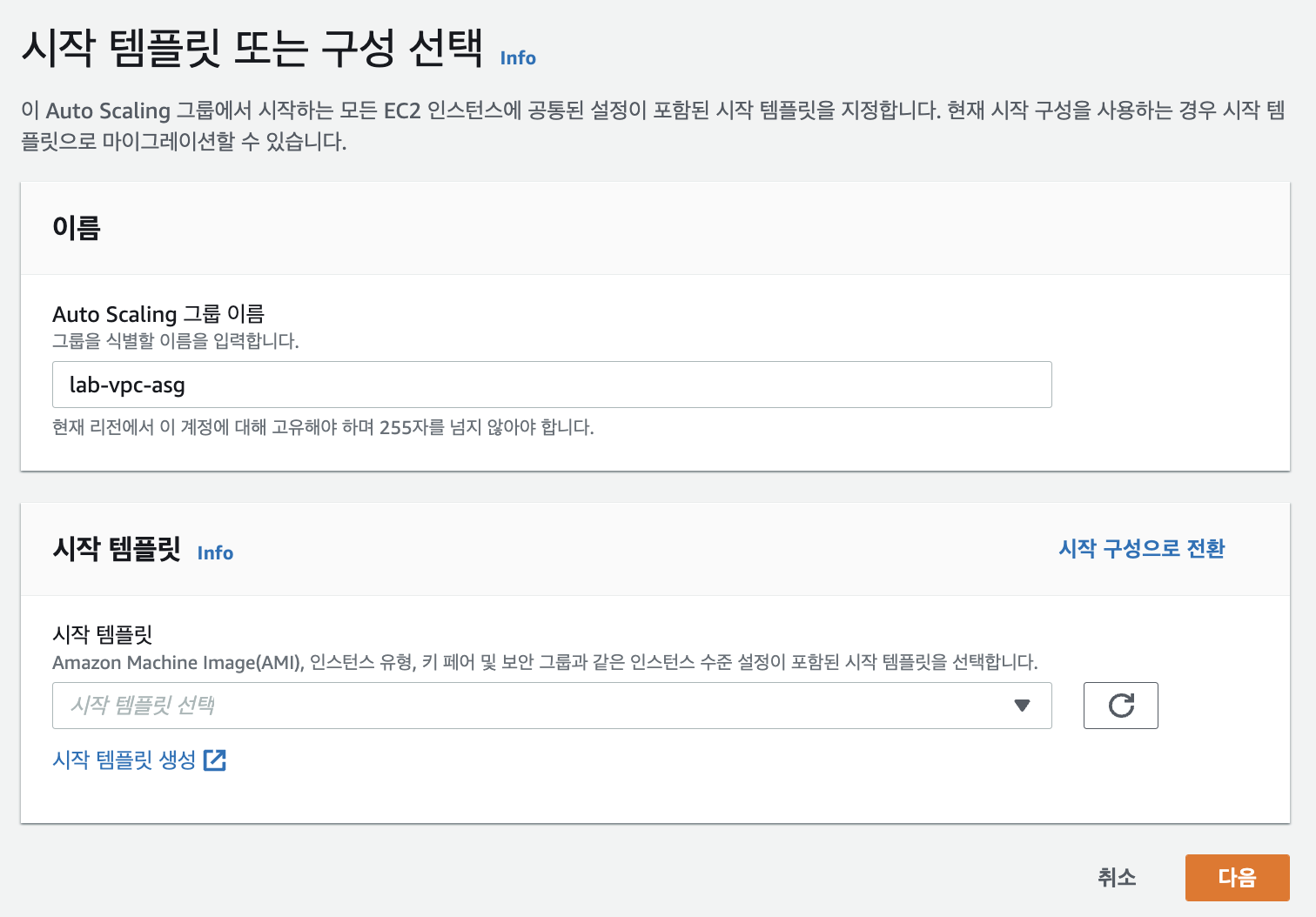 EC2 서비스의 왼쪽 리스트에서 "Auto scaling" -> "Auto scaling group" 을 클릭해서 Create Auto scaling group을 클릭한다. 그리고 위 사진처럼 설정화면이 나오는데 "Launch Template(시작 템플릿)"에서는 아까 만들었던 시작 템플릿을 클릭해준다.