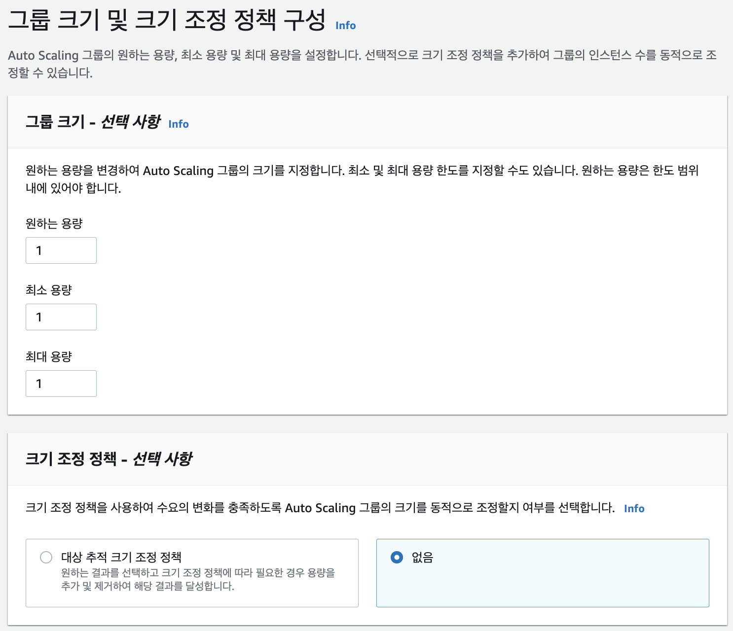 "그룹 크기 및 크기 조정 정책 구성(Configuration group size and scaling policies)"가 Auto scaling group 설정에 가장 중요한 파트이다. 해당 파트에서 "그룹 크기(Group Size)"는 Auto scaling group에서 인스턴스를 몇 개까지 확장할 건지 몇 개까지 축소할건지를 의미하게 된다.