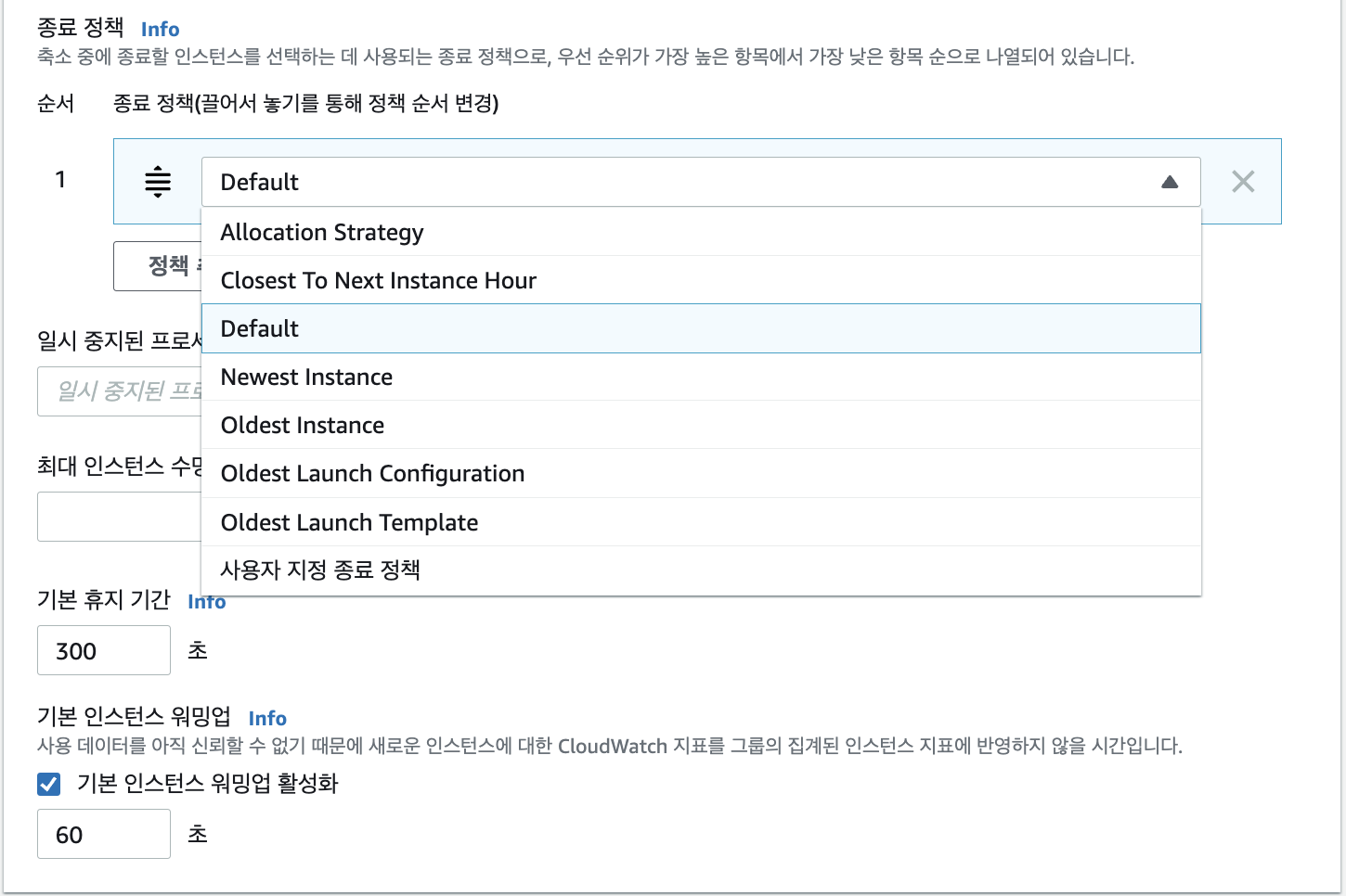 - Default에서는 정책이 크게 두 가지로 나뉜다. 첫 번째는 Auto scaling group의 인스턴스 중에 더 오래된 Launch 템플릿을 사용한 인스턴스를 선택하는 종료시키는 정책이 있다. 두 번째로는 동일한 Launch Template을 사용했다면, 인스턴스 중에 비용 결제 시간이 더 가까워진 인스턴스를 선택해서 종료시킨다.