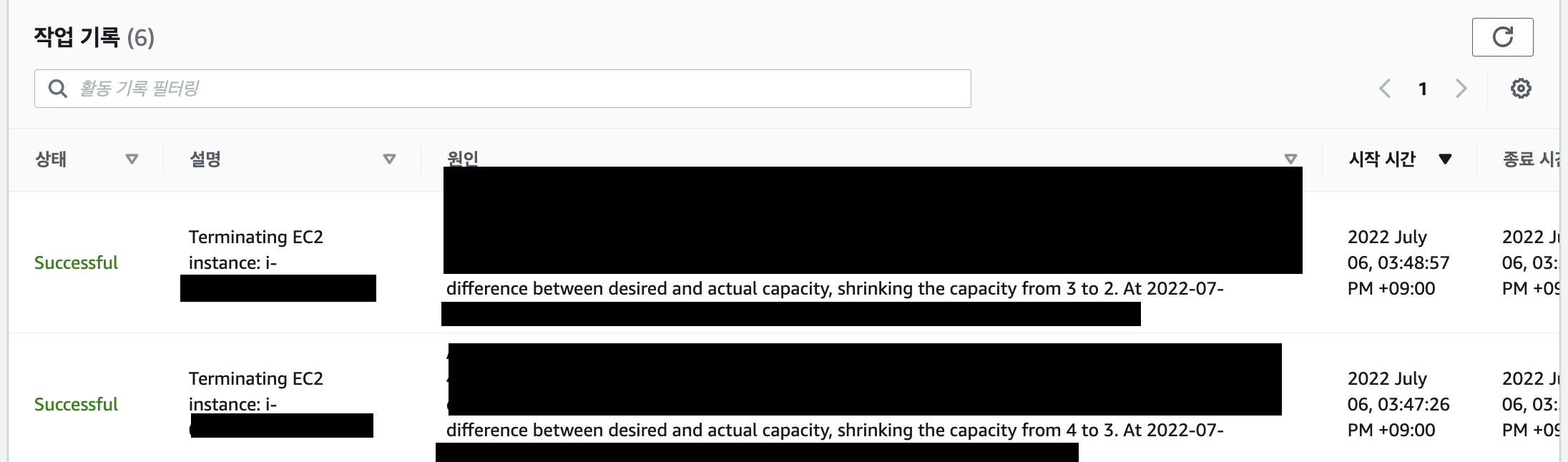 - 위의 예제에서 Termination Policy가 Default 정책이었기 때문에, 'Auto scaling group' -> '활동(Activity)'를 들어가서 확인해보면 가장 먼저 생성된 인스턴스부터 종료된 것을 알 수 있다. (각 인스턴스의 Launch Template을 동일하다)