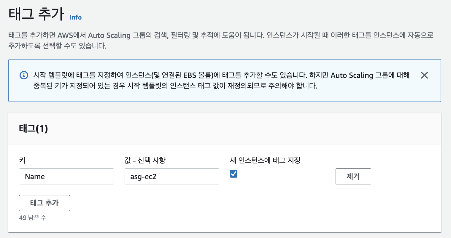 위와 같이 Tag를 정해주면, Auto scaling으로 생성된 인스턴스의 Name 태그는 "asg-ec2"라는 값을 가지게 된다.