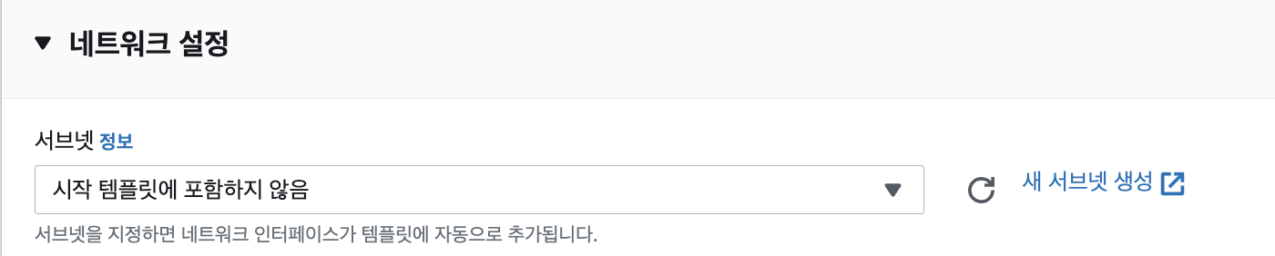 그리고 해당 Launch Template을 만들 때에 특정 서브넷으로 국한시키지 않기 위해 'subnet'은 '시작 템플릿에 포함시키지 않음(Don't include in launch template)'을 선택한다.