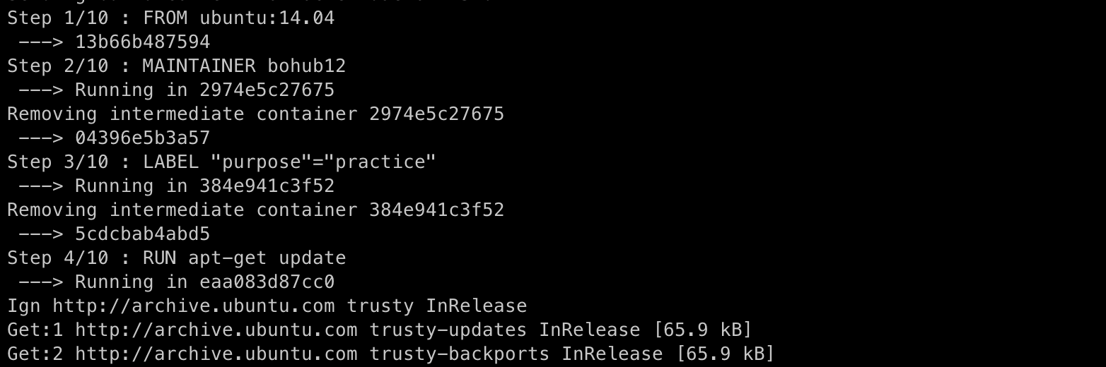 build 명령어는 Dockerfile에 기록된 대로 컨테이너를 실행한 뒤 완성된 이미지를 만들어낸다. 그렇지만 이미지로 만드는 과정이 하나의 컨테이너에서 일어나는 것은 아니다. 이미지를 빌드할 때 나오는 다음과 같은 출력 결과를 통해 이를 어느정도 짐작할 수 있다.