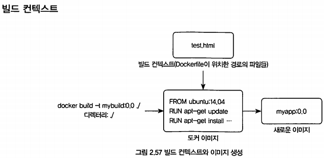 빌드 컨텍스트는 Dockerfile에서 빌드될 이미지에 파일을 추가할 때 사용된다. Dockerfile 에서 이미지에 파일을 추가하는 방법은 앞에서 설명한 ADD 외에도 COPY 가 있는데, 이 명령어들은 빌드 컨텍스트의 파일을 이미지에 추가한다. 위 예제에서는 빌드 경로를 ./로 지정함으로써 test.html 파일을 빌드 컨텍스트에 추가했으며, ADD 명령어를 통해 빌드 컨텍스트에서 test.html 파일을 이미지에 추가한다.