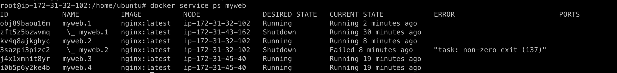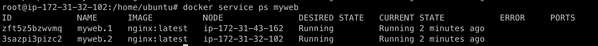 서비스의 자세한 정보를 확인하려면 docker service ps [서비스 이름]과 같이 입력하면 된다. 이 명령어로 서비스 내의 컨테이너의 목록, 상태, 컨테이너가 할당된 노드의 위치를 알 수 있다.