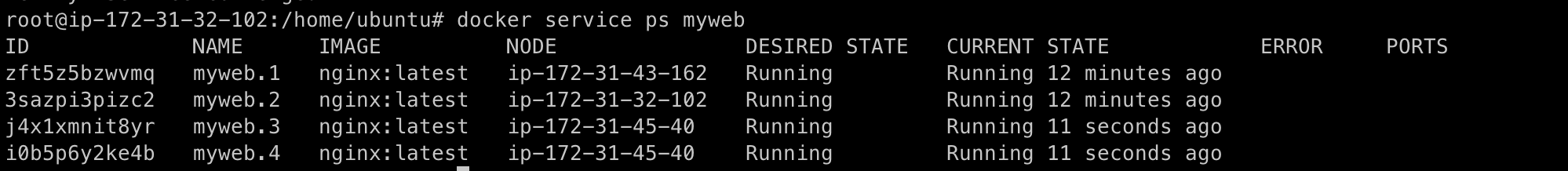$ docker service scale myweb=4