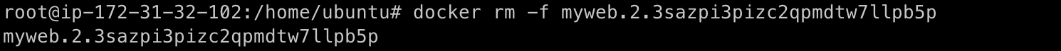 앞에서 이야기한 것처럼, 복제 모드로 설정된 서비스의 컨테이너가 정지하거나 특정 노드가 다운되면 스웜 매니저는 새로운 컨테이너를 생성해 자동으로 이를 복구한다. 위에서 생성한 myweb 서비스 중 컨테이너 하나를 삭제해보자.