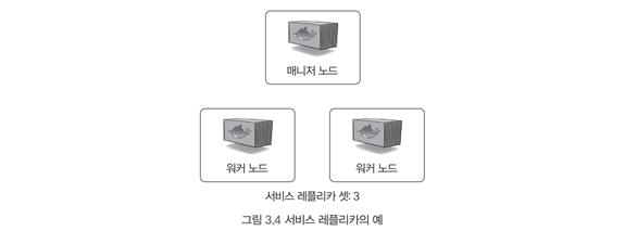 이처럼 함께 생성된 컨테이너를 레플리카(replica)라고 하며, 서비스에 설정된 레플리카의 수만큼의 컨테이너가 스웜 클러스터 내에 존재해야 한다.