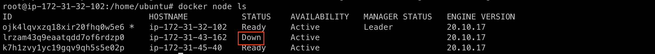 매니저 노드에서 docker node ls 명령어를 통해, worker1 노드의 상태가 Down으로 바뀐 것을 확인할 수 있다. docker service ps 명령어로 다시 컨테이너의 목록을 확인해보면 종료(shutdown)됐으며, 이를 복구하기 위한 컨테이너가 manager 노드에 생성되었음을 알 수 있다. [아래 이미지 참고!]