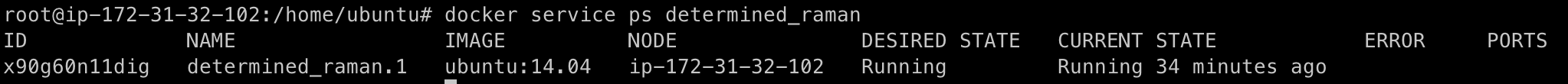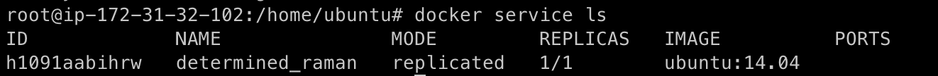 서비스를 생성했다면, 서비스의 목록을 확인해 방금 생성한 서비스가 정상적으로 구동하고 있는지 확인할 수 있다. 스웜 클러스터 내의 서비스 목록을 확인하는 명령어는 "docker service ls" 이다. 서비스 이름은 따로 정의하지 않았기에 서비스의 이름이 determined_raman으로 무작위로 설정된 것을 알 수 있다.