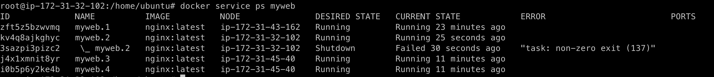뭔가 새로운 컨테이너가 생성되었다. 추가적으로 3개의 노드 중 swarm-worker1 노드의 도커 데몬 프로세스를 종료해 임의로 노드 장애 상태를 만들어본다.
