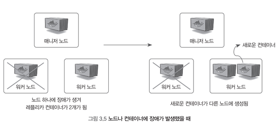 다운됐던 노드를 다시 시작해 정상적인 상태를 회복해도 장애를 복구하기 위해 다른 노드로 옮겨진 컨테이너가 해당 노드에 자동으로 할당되지는 않는다. 위 예에서 worker1 노드에서 도커 엔진을 다시 시작해 컨테이너를 실행할 수 있는 환경을 복구해도 myweb.1 컨테이너가 다시 worker1 노드로 돌아가는 재균형(rebalance) 작업이 일어나지는 않는다는 뜻이다.