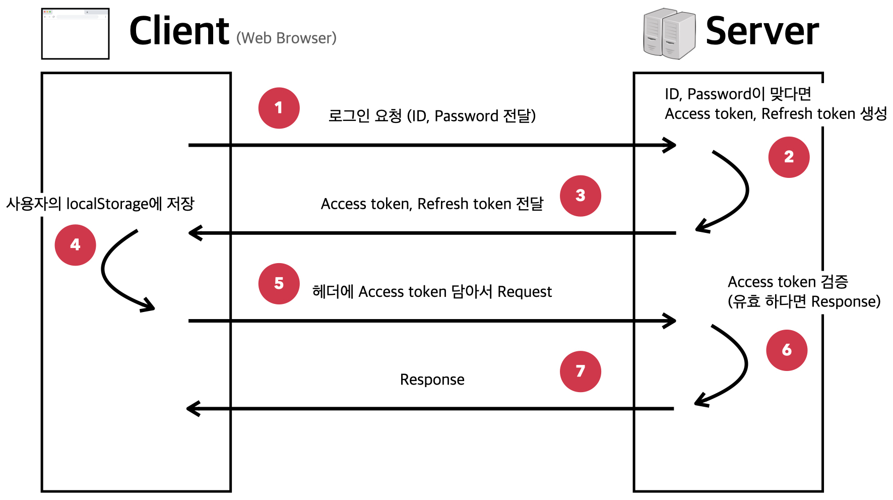 - 서버에서는 Access token을 검증하고, 응답을 클라이언트로 보낸다.