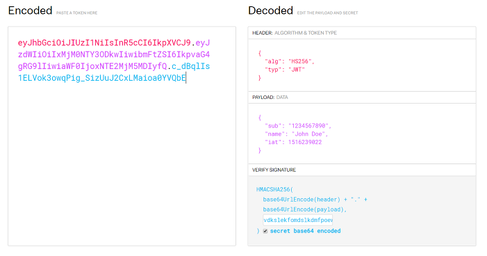 - iat: 토큰이 발급된 시간 (issued at), 이 값을 사용하여 토큰의 age 가 얼마나 되었는지 판단 할 수 있습니다.