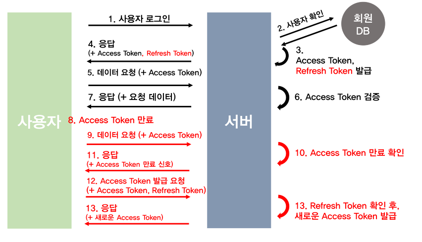 - Access Token과 Refresh Token을 서버로 보내서 새 Access Token을 요청한다 → 서버에서는 DB에 저장된Access Token, Refresh Token쌍과 클라이언트에서 보낸 토큰 쌍들을 비교한다 → 일치하면 새 Access Token토큰을 발급해준다.