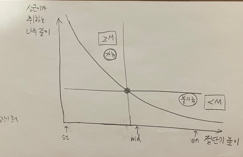 만약 중간에 절단기 높이가 높아졌는데 상근이가 취하는 나무 길이가 증가하는 등의 함수가 그려진다면 이 문제는 매개 변수 탐색 및 이분 탐색으로 풀 수 없는 문제이다. 이분 탐색의 기본 조건은 정렬되어 있는 배열이 전제조건이기 때문!! 이제 코드를 짜는 것은 간단하다. 절단기 높이를 start, mid, end 변수를 두고 기존에 이분탐색 문제처럼 풀면 되는 것이다.